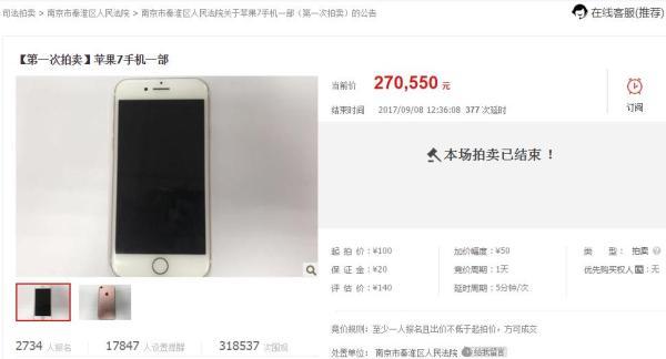 起拍价100元的二手苹果手机,正在司法拍卖平台拍出27万元的“天价”。9月7日,南京市秦淮法院正在淘宝网司法拍卖平台上公开拍卖一部二手苹果7手机,最终,该部手机落拍价为270550元。这场大幅度溢价的司法网拍激发普遍关心。