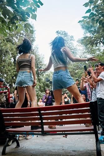 穿过一条只能两人并排行走的逼仄小道,里边就是出名的“尬舞网红一条街”。它位于人平易近公园取河水发黑的金水河之间的狭长河堤上。