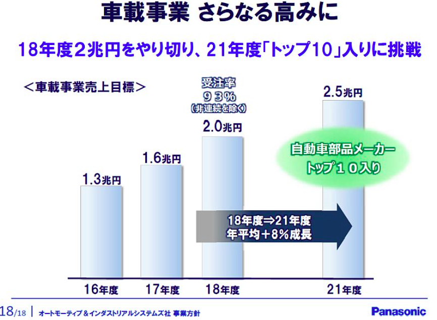 按照松下打算,他们但愿到2018年车载营业发卖额可以或许初次冲破2万亿日元,而到了2021年松下可以或许成为全球前十位的汽车零部件企业。