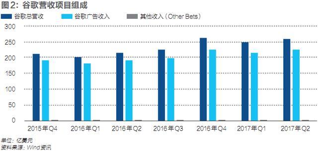 Alphabet营业布局的特殊之处正在于,这家控股公司本来就是正在Google的根本上降生,从2015年二季度起头改变架构至今,Google占领了Alphabet全体营收中的大头,占比一直连结正在99%之上(除了2016年第四时度这一数字为98.995%)。取Google并列的是那些“疯狂”的立异营业。