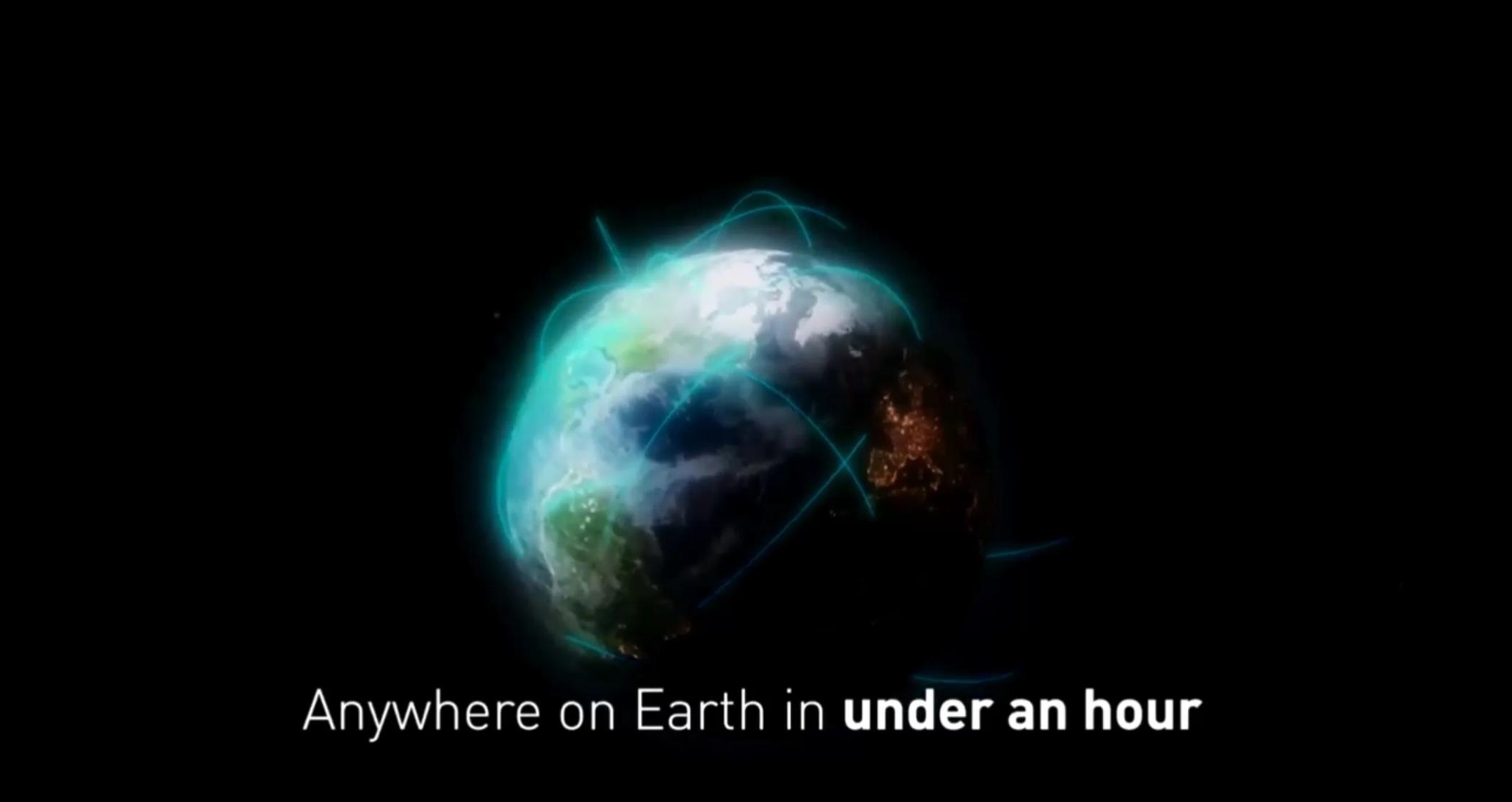 这幅插图描述了借帮大型飞船实现地球上城际旅行的可能性。一枚庞大的SpaceX公司火箭照顾着乘客从纽约市附近的一个漂浮发射台发射升空前去上海。