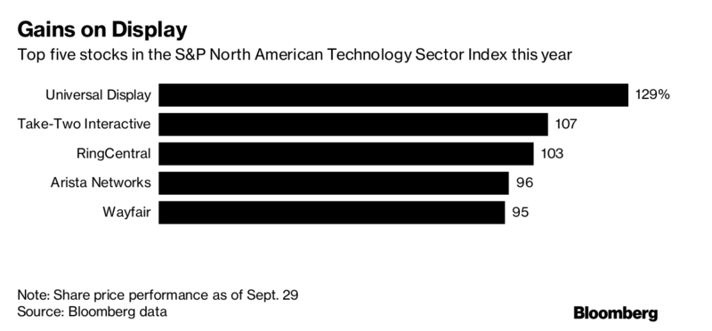 网易科技讯 9月30日动静,据彭博社动静,借苹果春风,环宇显示手艺公司(Universal Display)本年的股价已大涨129%,市值添加了34亿美元。正在标普科技业指数的283支股票中,它的涨幅最大,市销率最高。