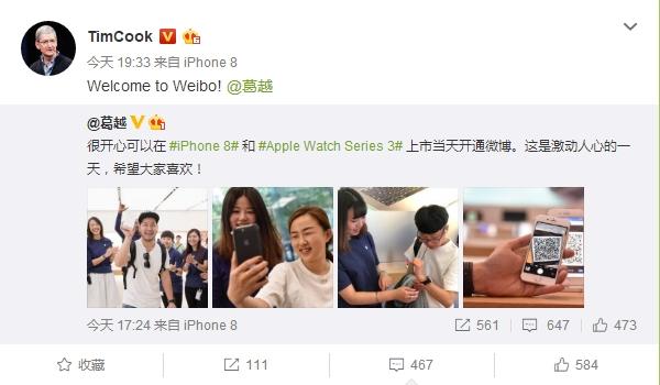 今天是iPhone 8首发的日子,伴跟着iPhone 8的全面上市,苹果大中华区董事总司理葛越开通了微博帐号并发了第一条微博,庆贺iPhone 8首卖。