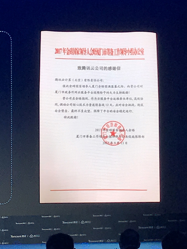 9月13日,金砖会议筹备组向腾讯云发去感激信。