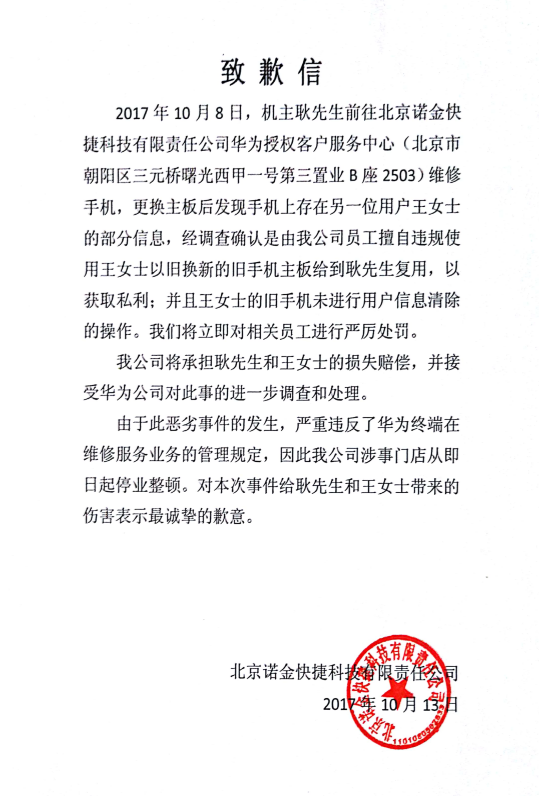网易科技讯10月13日动静,华为授权客户办事核心针对违规操做,以致用户消息泄露一事,进行了报歉,并对相关涉事人员和店面了处置。