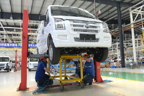 5月14日,工人正在江苏如皋陆处所舟电动汽车出产线上安拆汽车电池。()