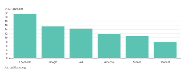 若是阐发研发投入取发卖(收入)的占比,阿里正在2009年到2010年,阿里这个占比维持正在17%-18%,到2017年降到了不脚11%。而Facebook、谷歌、百度、亚马逊的这个占比都跨越了阿里,Facebook的占比达到21%,阿里只是跨越了腾讯,腾讯不跨越8%。