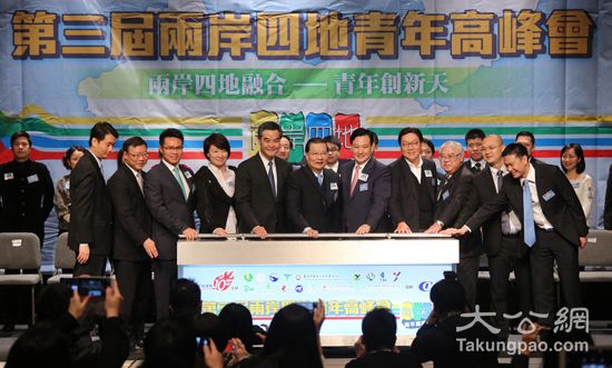 由青年民建联主办的 第三届两岸四地青年高峰会 昨日在柴湾青年广场举行,前商务及经济发展局局长马时亨、观澜湖集团主席兼行政总裁朱鼎健、澳门立法会议员施家伦和来自台湾的对外关系协会秘书长黄奎博担任主讲嘉宾,与近百名青年观众探讨区内青年发展问题。行政长官梁振英和中联办副主任林武出席开幕礼,立法会主席曾钰成则致闭幕辞。
