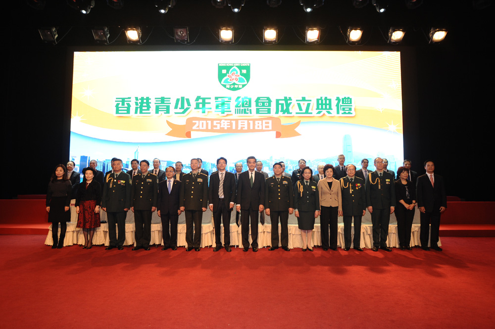 香港青少年军总会成立仪式昨日下午在驻港部队昂船洲军营隆重举行。新成立的青少年军由行政长官梁振英、中联办主任张晓明以及解放军驻港部队司令员谭本宏担任荣誉贊助人;全国政协副主席董建华担任首席荣誉会长;行政长官梁振英夫人梁唐青仪担任总司令;总会会长、主席及总监则分别由全国政协常委戴德丰、港区人大代表兼青年事务委员会主席陈振彬及信和集团执行董事黄永光担任。