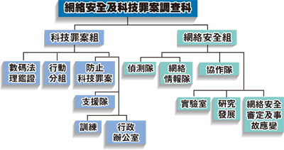 据本报获悉,香港警方对这些网上煽动和鼓吹非法集会及暴力犯罪的行为相当重视,过去一直由商业罪案调查科下属的科技罪案组负责侦查。去年因应违法 占中 事件,该组已经增加了人手,对网上涉嫌犯罪的事件进行全面调查。今年1月初,警方更将科技罪案组升格为网络安全及科技罪案调查科,将由一位总警司带领。由于总警司的职位相当于政府的首长级一级,新增职位需要立法会人事编制小组审批,有关文件已送到立法会,正等待排期审议。目前,该科的运作就由原先负责科技罪案组的高级警司陈永安主持,下辖 科技罪案组 、 网络安全组 两个组,分别由两位警司带领(架构见附图)。