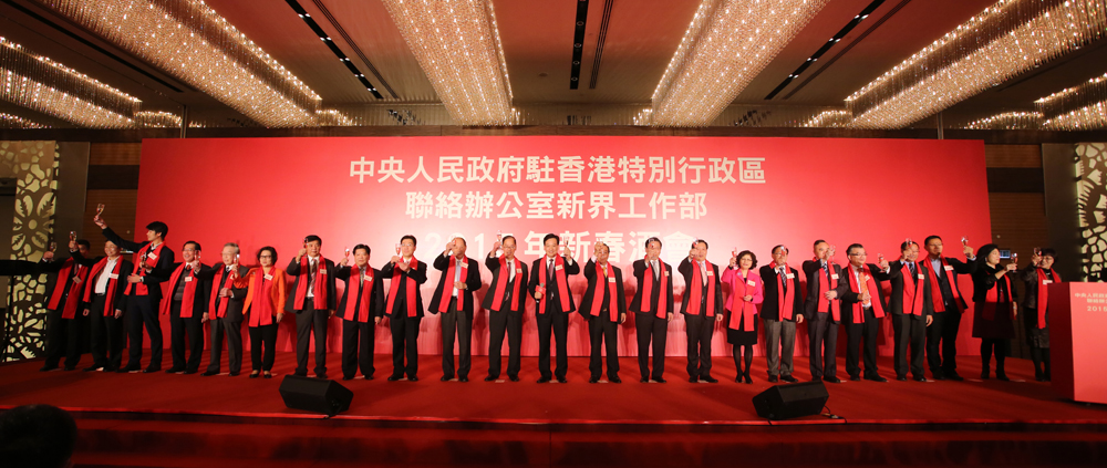 中联办新界工作部昨日携手新界主要爱国爱港社团举行新春酒会,展现了新界大团结、大融合的社会主流生态和中联办新界工作部服务新界繁荣稳定的职能定位。中联办副主任林武带领祝酒,特区民政事务局局长曾德成、乡议局主席刘皇发、行政会议成员张学明,新界工作部负责人及新界主要爱国爱港社团首长共同主礼祝酒仪式,1500多名香港各界人士出席酒会,欢聚一堂,把酒迎春,共贺新禧。现场气氛热烈欢腾,喜气洋洋。
