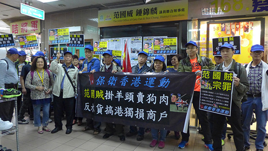 保卫香港运动召集人傅振中表示,范国威作为立法会议员,打着维护香港市民的利益,宣扬本土主义言论,实则是想搞 港独 分裂国家。又指范国威指使手下梁金成以反水货客之名反中乱港,用粗暴的语言和行为去攻击来港的自由行旅客,破坏两地融合;其行为使许多受影响商户被迫落闸,影响市民生意及生活。