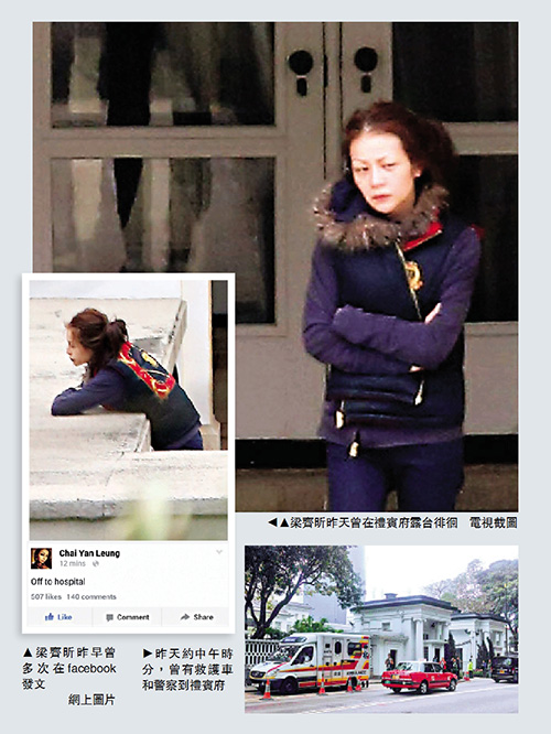 梁齐昕由昨日凌晨开始,多次在facebook发文,称自己被母亲辱骂、推撞和掌掴,希望永远离家出走。约中午时分,曾有救护车和警察到礼宾府。梁振英其后主动会见传媒,说明有关情况。他神情凝重地表示,认识齐昕的人都知道其健康出现一些问题,她从英国停学返港后,作为父母可就近照顾,但在香港环境下,女儿作为一名主要公职人员的20多岁女儿,面对相当大生活压力。他们一家住在礼宾府,他上任特首后礼宾府公务活动特别多,故指在此环境下,不太有利于女儿休息,令她情绪有起伏。