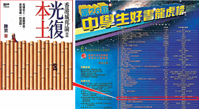 本报周二以头版《教协播毒》为题报道,教协每年主办 中学生好书龙虎榜 活动的60本候选书目中,今年赫然有陈云的著作《香港城邦论Ⅱ光复本土》, 城邦论 更有机会成为 十本好书 获奖,令人质疑教协借推广阅读活动为名,向校园宣扬 港独 意识,而活动更是由康文署香港公共图书馆借出场地协办,社会各界直指极不恰当。