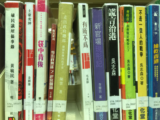图:公共图书馆放置了不少如毛孟静、梁家杰及黄毓民等反对派人士的书籍