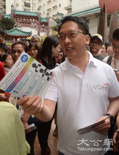 图:律政司司长袁国强在香港仔派发政改宣传单张\本报记者林良坚摄