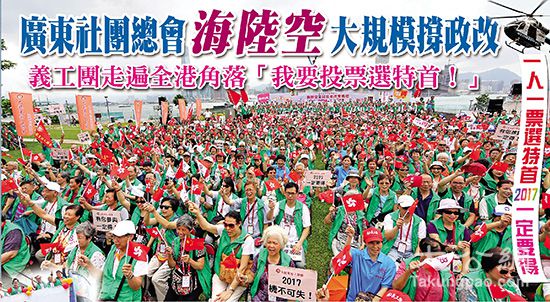 大公网5月15日讯(记者温宝生、魏子淇)香港2017年能否普选行政长官已去到最关键时刻,香港广东社团总会一向全力支持政改方案,继今年3月收到逾五万份会员签名支持政改,又于日前(5月9日)假香港金钟添马公园举行创新、空前规模的 海陆空全民撑政改启动礼 ,广总首席会长、香港义工联盟主席谭锦球,广总常务副主席林光如、广总常务副主席兼义工团团长马鸿铭等首长联同21个地级巿社团首长及会员合共二千名义工,不畏高温酷暑,烈日当空,上演了一场表现最团结、行动最全面、影响力最广的支持政改宣传活动,并在未来一周以实际行动于港九新界离岛摆设逾百个街站收集巿民支持政改方案签名,让反对派清楚了解全港市民的意愿﹕ 我要投票选特首!
