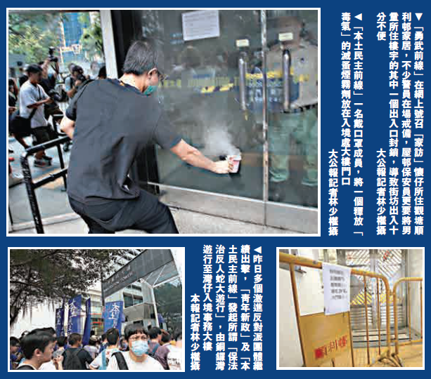 大公网5月26日电 (记者 陈达坚)激进反对派继续借怀仔事件闹事, 青年新政 及 本土民主前线 在闹市游行搞事,沿路高呼粗言秽语、以粗口指骂市民,更在入境处大楼释放 毒气弹 (灭蚤烟雾剂),又不顾卫生用口水将宣传单张贴在玻璃门上。 勇武前线 则在网上号召 家访 怀仔寓所,惹来街坊不满,指他们行为扰民、不知廉耻,专欺侮老弱。入境处重申,怀仔获发 行街纸 不代表已经获得任何居留身份,现阶段入境处处长不会就该儿童的个案行使酌情权。