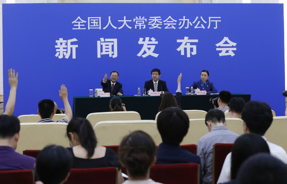 图:全国人大常委会法工委副主任郑淑娜(右)在记者会上指出,按基本法规定港澳特区应自行立法,维护国家安全 中新社
