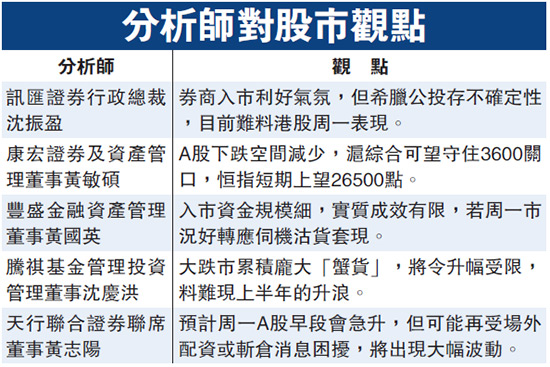 至于港股方面,沈振盈认为,港股同时受到内地及西方市场的影响,除了关注A股周一市况表现外,投资者需要同时留意希腊公投结果,现阶段难估港股周一表现。