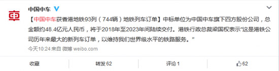 全球最大轨道交通装备制造企业中国中车成立半年多后,迎来大规模订单潮。中国中车今早发布公告,称旗下青岛四方股份公司中标香港市区线地铁车项目,总金额约48.4亿元人民币。此前,港铁公司也发布新闻稿,称其做出历来最大的铁路车辆投资,向青岛四方股份公司购买93列(744辆)地铁列车。实际上,这不仅是港铁史上最大规模的车辆采购,也是中国境内诞生的最大一笔地铁订单。