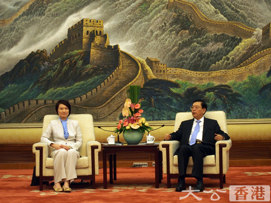 大公网7月24日电(记者 李柏涛 计梦慧 冯昊) 全国人大常委会委员长张德江今日(24日)上午在人民大会堂会见了正在北京访问的民建联代表团,会面持续约一个半小时。民建联主席李慧琼在会面后表示,张德江委员长充分肯定包括20个月政改期间民建联所做出的努力在内的建制力量,并善意提醒凡事政治化对香港发展没有好处,希望社会可以集中精力关注经济民生事项。