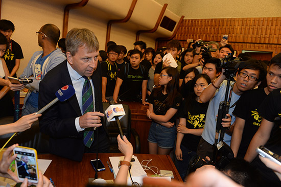 港大校长马斐森昨日向港大教职员、学生及校友发电邮强调,校方谴责任何暴力,不能容忍前晚学生在校委会开会期间冲入会场的行为,批评其行动完全不尊重校委会的保密性。他又说,校委会已有两名学生代表,学生有任何诉求都可透过代表在会上以冷静、理性的方式向其他校委会成员提出。