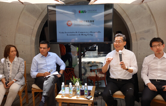 图:苏锦梁(右一)在墨西哥国家企业家协会主席举办的研讨会上致辞,介绍香港为初创企业提供的支援