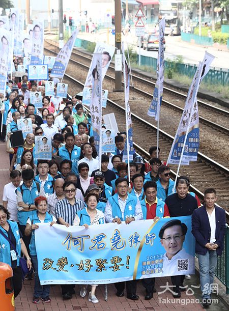 图:何君尧与支持者由乐翠轻铁站出发,游行至屯门码头,沿途高喊 改变好紧要,支持何君尧! 、 何君尧加油、加油、加油 等口号,士气高涨/大公报记者何嘉骏摄