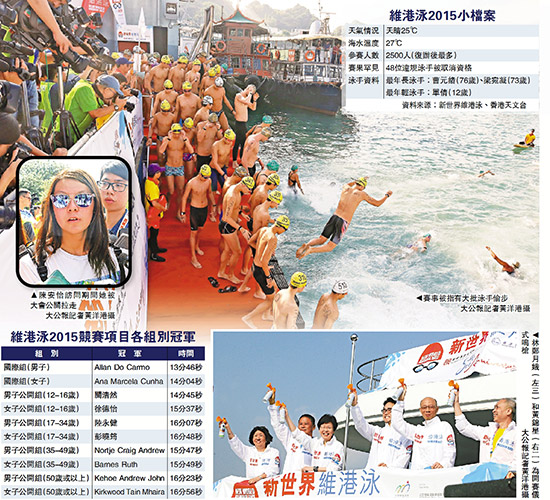 政务司司长林郑月娥及环境局局长黄锦星昨日一早主持开赛仪式。今年维港渡海泳是复办五年来参赛人数最多的一届,共2500名泳手。泳手分批由鲤鱼门三家村公众码头出发,横过维港,游至鲗鱼涌公园公众码头,全程约1.5公里,岸上有不少市民和参赛者亲友为泳手打气。赛事吸引不同年龄层的参赛者,年纪最小参赛者仅12岁,最年长的是76岁。