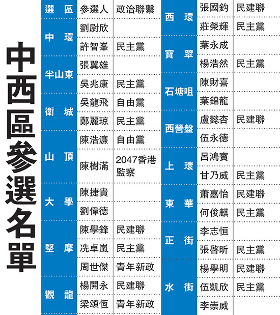 中西区有十五个小选区,统计上届区选成绩,派出六人参选的民建联胜出五个议席,派出九人参选的民主党却仅有四个议席,其他反对派政党一席未得。今次中西区选战依然是民建联与民主党之争,民建联维持六人不变,民主党却在十八区参选总人数大削三分之一情况下,在中西区不减反增,共派出十人,有企图重夺该区之势。