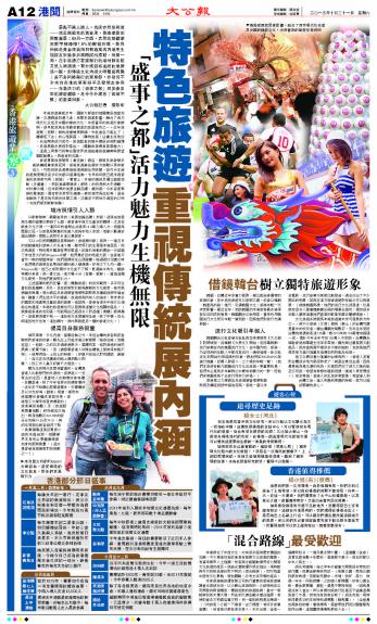 又以10月民间团体自发举办的 香港潮州节 为例,一连五日的活动据统计参与人次多达十万,虽然吸引的主要是本港居民,但亦为游客,特别是外国游客带来惊喜。记者于活动的最后一日结识了来自意大利的Filipponi夫妇,他们最终目的地是大阪,在香港只会作一晚的短暂停留,他们选择前往山顶游览。路过遮打花园之时,他们偶然发现在此举办的潮州节人头涌涌,好奇之下入内一观。Filipponi指,自己之前对潮州文化并不了解,更遑论牛肉丸、蚝饼等潮州美食,但一尝之后,他大叹十分 有趣、新鲜 ,直指这类文化感受,对他们更具吸引力。
