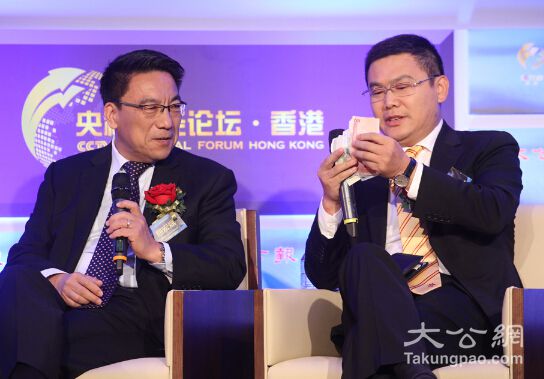 图:屈宏斌(左)和阎峰等嘉宾的钱包里都有人民币等多种货币