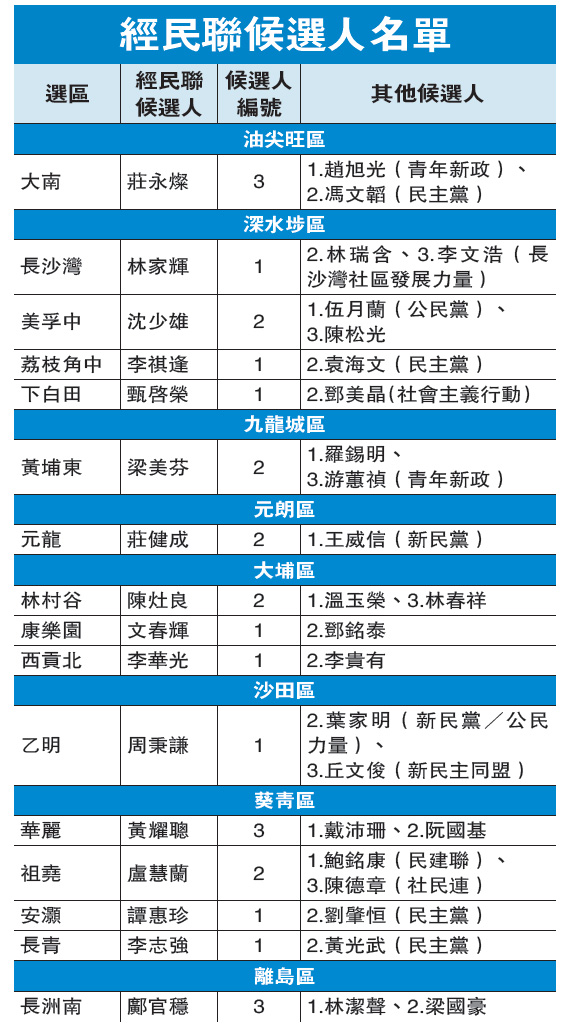 另外,前大埔乡事委员会主席、经民联成员文春辉今年四月卸任大埔区议会当然议员一职,今届区议会选举报名出战康乐园区,力争循民选途径重返议会,同区参选人还有报称独立的邓铭泰。