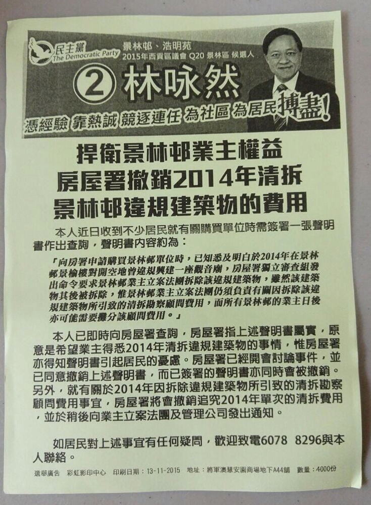 今届区议会选举,景林区是在西贡区一众选区当中,选情较为激烈的一区,争取连任的民主党林咏然,今届要面对服务当区多年的民建联社区干事温启明的挑战。正当双方都尽力拉票之际,林咏然上星期忽然印制大量宣传单张,以 扞卫景林邨业主权益 为题,声称自己接获居民查询,指景林邨景榆楼一座违规兴建观音庙去年被清拆,担心所有景林邨业主日后需要摊分该事件的清拆勘察顾问费用。林咏然声称自己 即时向房屋署查询 后,获告知 房屋署将会撤销追究2014年单次的清拆费用,并于稍后向业主立案法团及管理公司发出通知 云云。