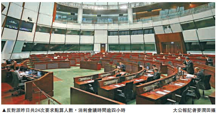 立法会昨日继续二读版权修订条例草案,并延续辩论上次休会前由工党何秀兰提出的中止待续议案。反对派继续采取拉布策略,人民力量及社民连三名议员连番要求点算法定人数,令议会几度出现流会危机。多名反对派议员发言时,坚持要政府接纳他们提出的修订,否则会不断拉布。秘书处表示,连同立法会主席曾钰成开会时要求点算人数,立法会昨日共25次点人数,用上约四小时四十八分钟。
