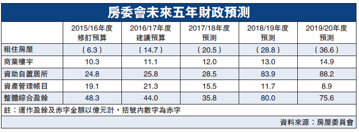 房委会财务委员会昨日开会审议本年度财政修订及未来五年财务预算。房委会修订2015/16年度综合盈馀有48.3亿元,比去年预算略多2.2亿元,主要因为公屋营运赤字减少、出售资助房屋收入增加,但部分被资金管理帐目抵销。公屋营运赤字由去年预计的9.9亿元减至6.3亿元,原因是公屋维修开支及折旧较预期少,至于出售资助房屋收入由18.7亿元增至24.8亿元,则因出售房屋价格较预期高且补价单位数量较预期多。