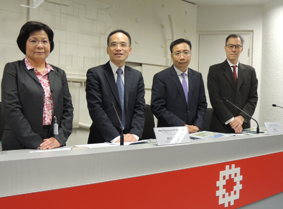 图:房委会财务小组委员会昨开会通过新年度预算案,房屋署助理署长张吴曼娥(左起)、财务小组主席苏伟文、房屋署副署长李国彬及房屋署总财务经理谢世业会后见传媒