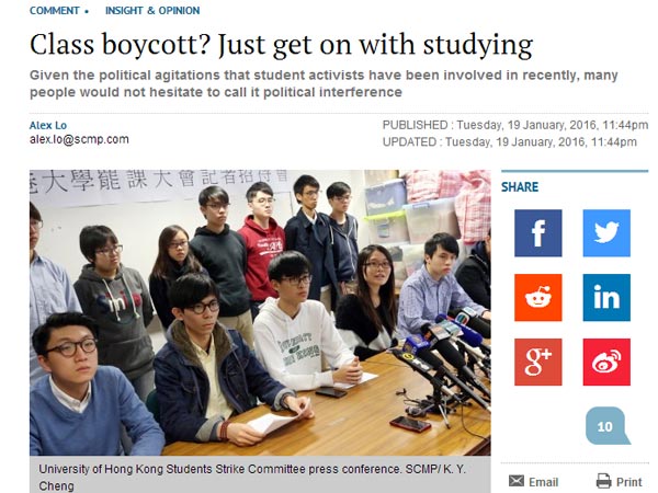 卢纲在1月19日《南华早报》网上发表题为罢课?不如努力学习!(Class boycott? Just get on with studying)最新文章。文中提出疑问,假设香港大学的校务委员会或校管理当局,决定检讨或废除学生会等以学生为主体的组织,大家会怎样看?