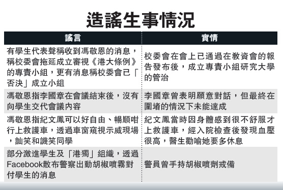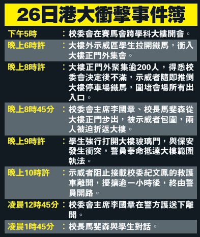 港大重演去年七月学生冲击校委会会议、禁锢校委的翻版,激烈程度有过之而无不及。多名港大校委都指当晚的冲击场面是不必要,可能与信息混乱有关,暗示学生会会长冯敬恩是罪魁祸首,加上部分激进学生、本土派组织等在社交网站声称警察出动胡椒喷雾对付学生,激发示威学生情绪,并多番在社交网站煽动校外学生加入,导致混乱情况一发不可收拾。