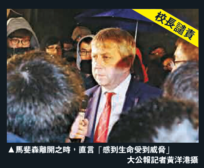 校长马斐森当晚离开之时,直言感到生命受到威胁,对冲击事件感到失望。他昨日下午向全校师生及校友发出电邮,谴责学生拒绝让校委离开,令校委会委员、保安人员以及他本人置于危险之中。他表明,校方一直愿意与学生进行理性讨论,但拒绝接受暴民统治(mob rule),更不能纵容暴徒行为。他批评围堵令包括他在内的多名校委被困几小时都无法离开,行动完全无必要,因为会议结束前校委已一致同意成立专责小组检讨大学管治,已满足学生的诉求。马斐森在信中末段提及,前晚的事件进一步损害港大声誉,并表示警方可以索取当晚所拍到的影像及照片。此外,马斐森亦表明,他与李国章会在十日内与学生会面。