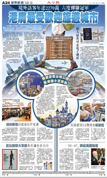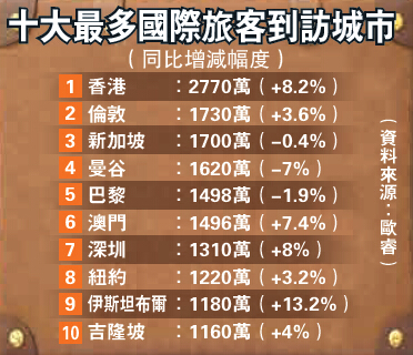 研究还指出,受惠于中国旅客增加、航班衔接改善、签证限制放宽等因素,亚洲各大城市旅客人数都出现增长迅速的趋势,这也意味着香港榜首的地位将会受到挑战。