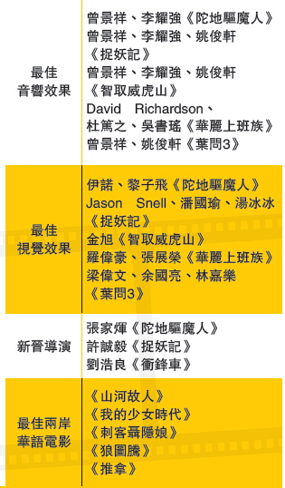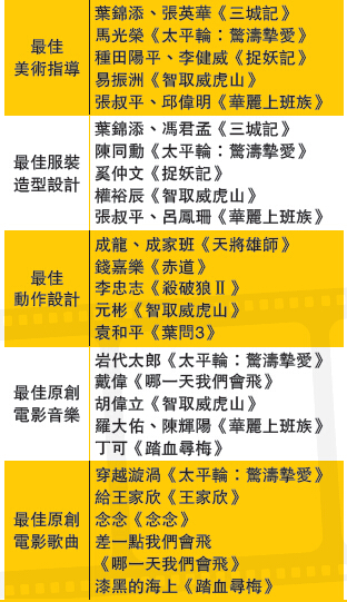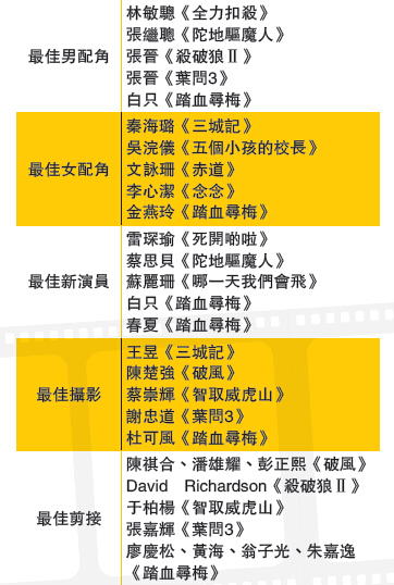 大公网1月30日讯 (记者吴珊珊)第三十五届香港电影金像奖颁奖典礼将于四月三日举行,大会昨日公布入围名单,《踏血寻梅》继在台湾金马奖及香港电影评论学会上扬威后,再于金像奖获十三项提名,成为提名最多的电影。而郭富城将与张家辉、梁家辉、刘德华(华仔)及张学友竞逐影帝殊荣,城城替导演翁子光高兴,亦多谢评审对角色的认可,而影后提名就有林嘉欣、春夏、汤唯、张艾嘉及杨千嬅活动。