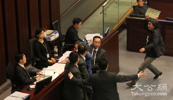 图:财委会进行投票时,黄毓民和梁国雄突冲向主席台,企图中止投票,大批保安人员拦截/大公报记者麦润田摄