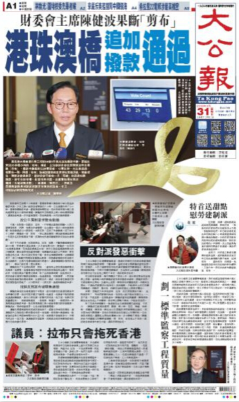 大公网1月31日讯 (记者龚学鸣)港珠澳大桥香港口岸工程的54亿6千万元追加拨款申请,历经反对派30多个小时的拉布拖延;立法会财委会主席陈健波昨日果断剪布,拨款申请最终以29票赞成、13票反对,大比数通过。投票前一刻,四个拉布议员试图冲向主席座位制造混乱,险象环生。陈健波会后表示,若财委会不能在一月死线前通过有关拨款,会令公帑受损,影响市民利益,并直言如果反对派继续有破坏无建设,香港将无运行。运输及房屋局副局长邱诚武感谢支持项目的议员,令工程能按计划完整地完成。