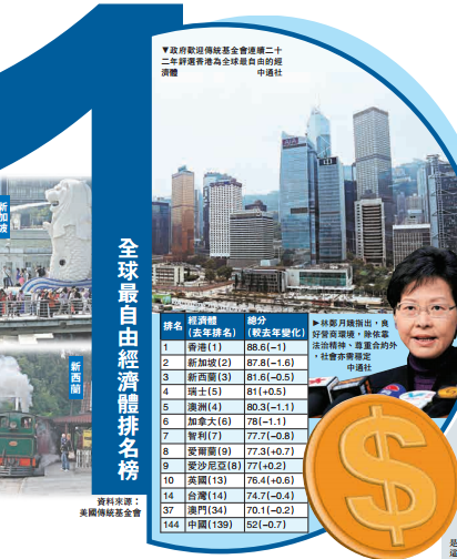 此外,《经济自由度指数》报告在评审指数十项指标中,香港在其中七项包括营商自由、贸易自由、金融自由、投资自由、产权保障、政府开支、投资自由等获90分或以上。岭大经济系兼任教授何泺生则指,本港过去一年在经济自由方面的政策无大改变,所以香港得以维持全球最自由经济体之冠的排名。
