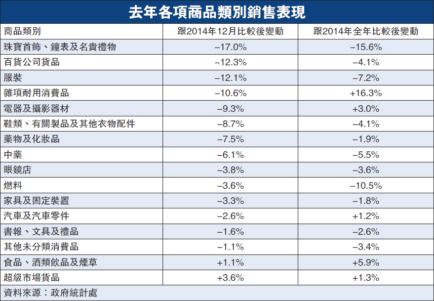 政府统计处昨日公布最新零售业销售额数字。去年12月,零售业总销货价值的临时估计为437亿元,较2014年同期跌8.5%,数字亦是去年最大单月跌幅活动!扣除期间价格变动后,去年12月零售业总销货数量较2014年同期跌6.1%。总结去年全年,零售业总销货价值为4752亿元,较2013年全年下跌3.7%,表现是自2003年以来,即沙士时期后最差,连续第二年录得跌幅。