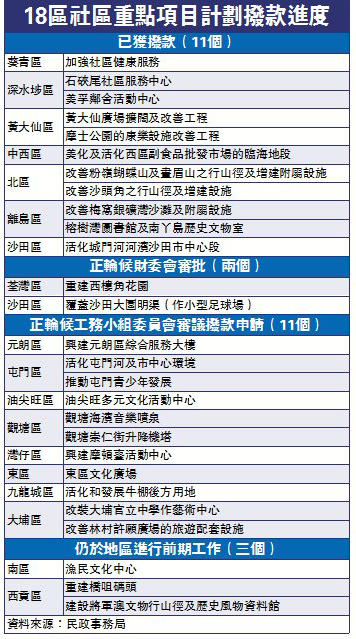 行政长官梁振英早于2013年《施政报告》,已提出地区问题地区解决,地区机遇地区掌握理念,但18区受制于无钱无权,难望主动行动。虽然特首于今年《施政报告》建议落实各区开设地区管理委员会,向民政事务专员赋权部分公共管理及环境卫生问题;但于2013年各区先后提出的一亿元社区重点项目计划,则很可能受立法会财委会拉布所拖累,迟迟未能取得一亿元,令工程濒临胎死腹中。