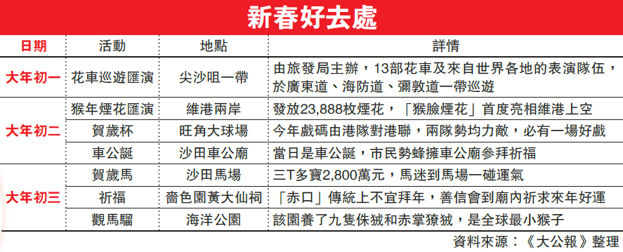 大年初一晚上的花车巡游,以及年初二维港的烟花汇演,警方下午起将港九多处实施封路及改道措施。配合烟花汇演,定期渡轮会维持服务至晚上7时30分,海事处会在初二下午2时至晚上11时在湾仔会展对出海面设立禁区,晚上7时至约9时15分在维港中部设立限制区,只准获批船只可以驶入,水警及海事处会针对船只超速及超载情况加强巡查。