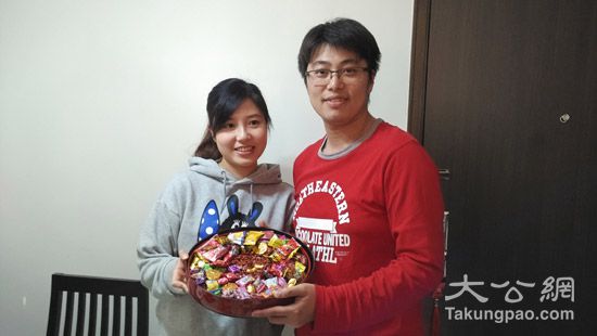 图:颜汶羽与太太向读者拜年/大公报记者朱晋科摄